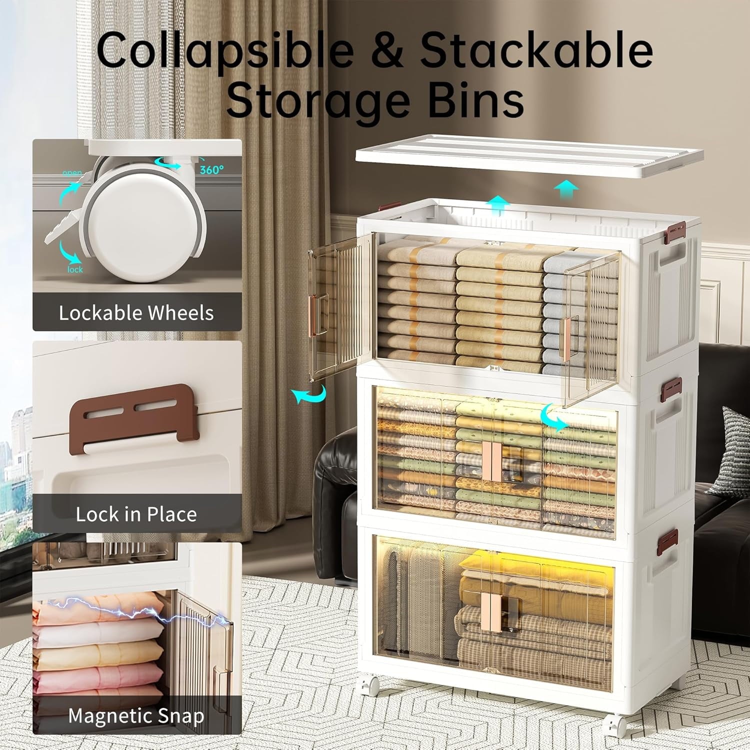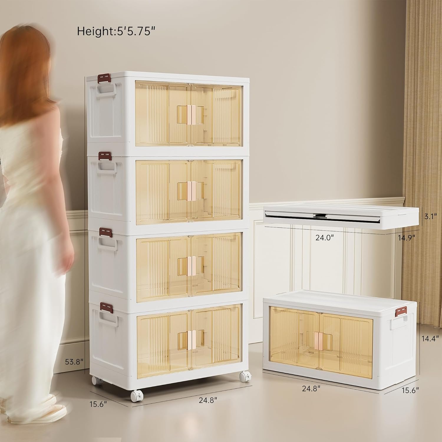 4 Tier Plastic Storage Bins with Lid 23QT, Stackable Storage Containers with Wheels, Folding Storage Boxes, Collapsible Storage Bins, Closet Organizers and Storage for Living Room,Office,Dorm